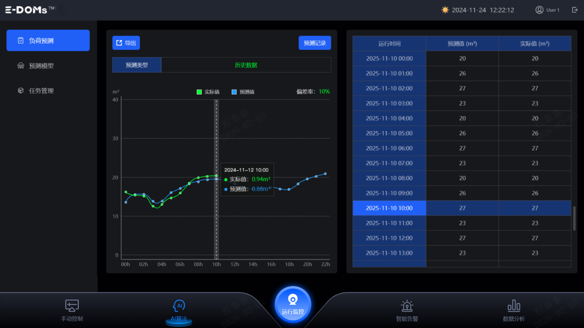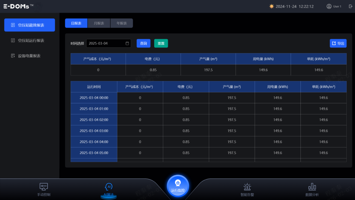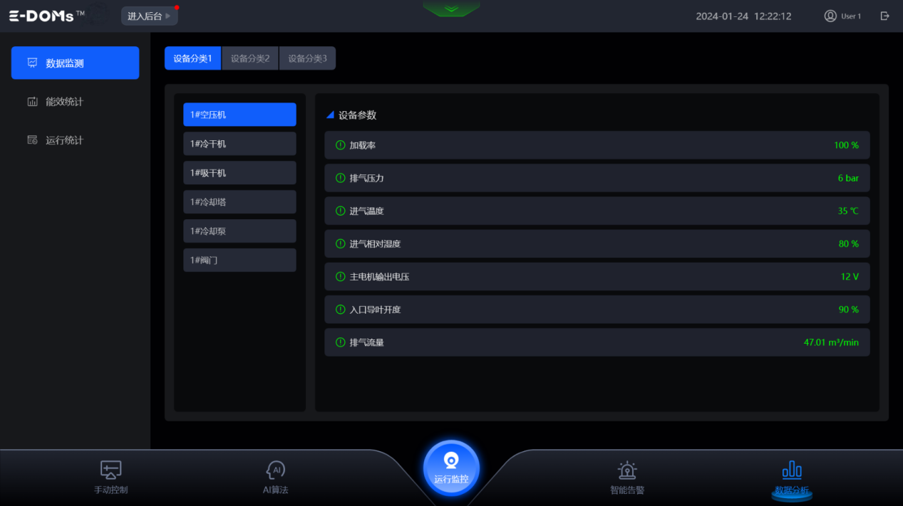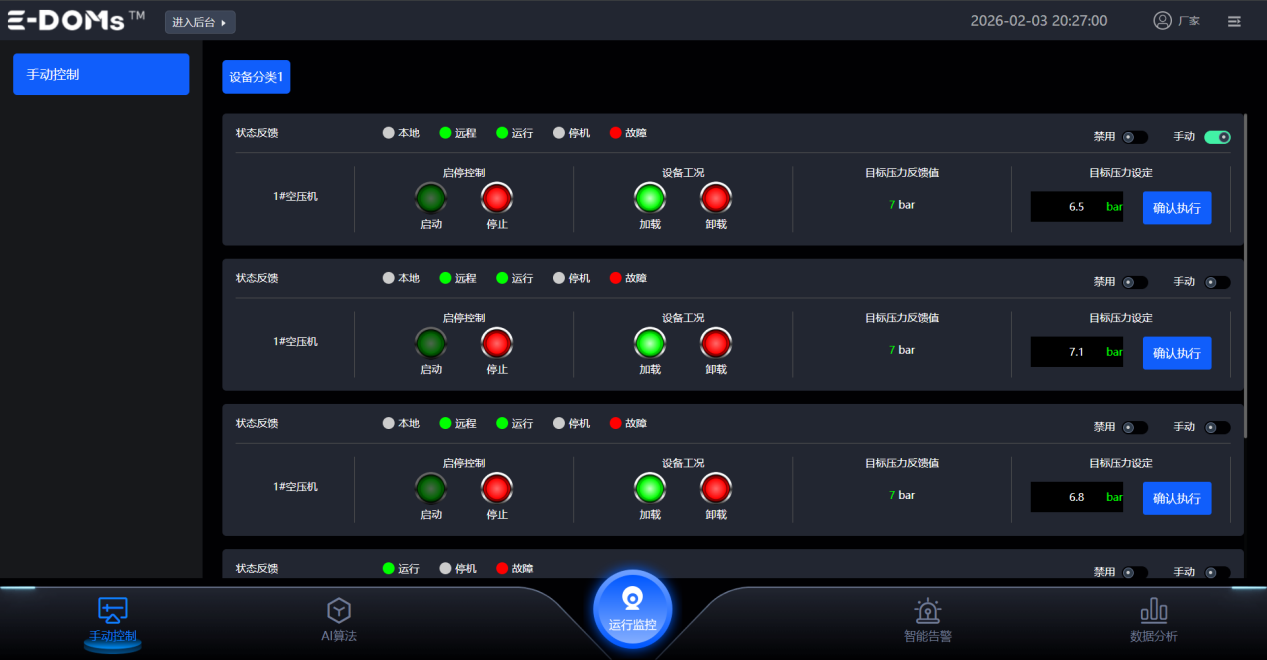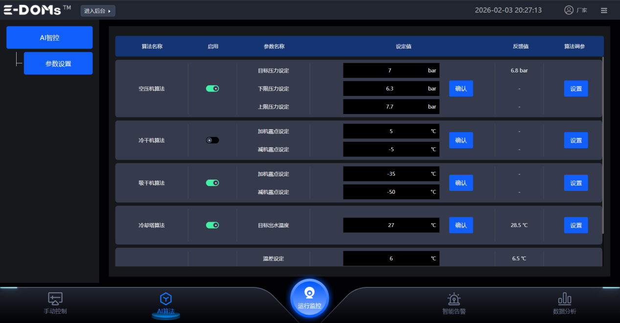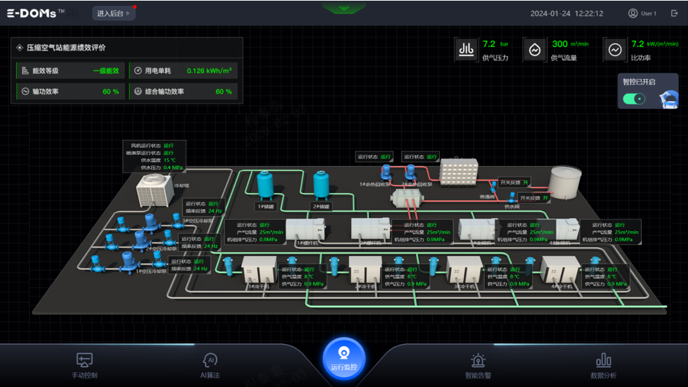 以E-DOMs™空压系统运行智控终端为核心支撑,构建「设备建模→负荷预测→全局寻优」智能闭环,实现能效跃升 10%-30%,以算法定义一级能效空压站房新标杆。